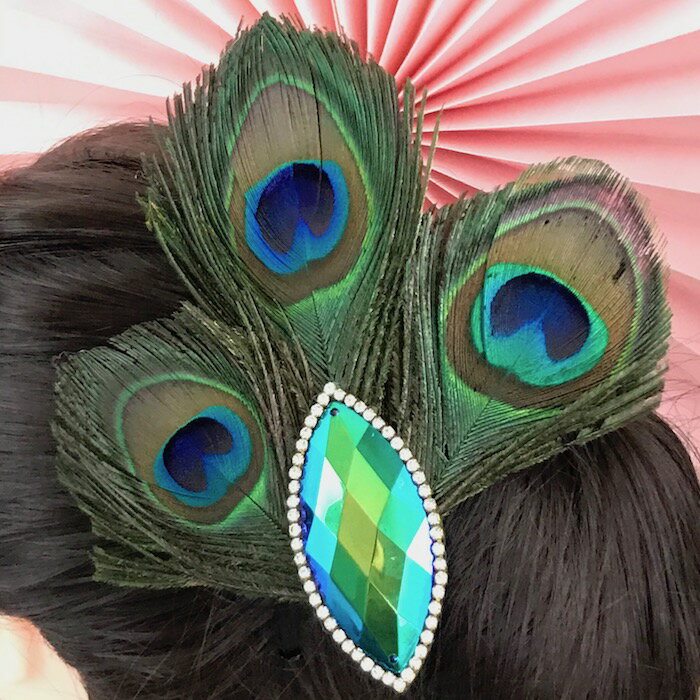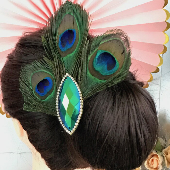 ラインストーンがキラキラ輝くピーコックフェザーの ヘアアクセサリーになります。